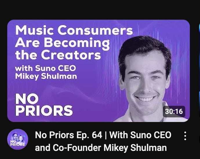 On y vient. Car un autre événement a, cette fois dans le domaine de l’IA musicale, secoué la toile ces derniers jours : l’interview quasi surréaliste que le CEO de Suno, Mikey Shulman a donné sur la chaîne YouTube 20VC du podcasteur économique Harry Stabbings.