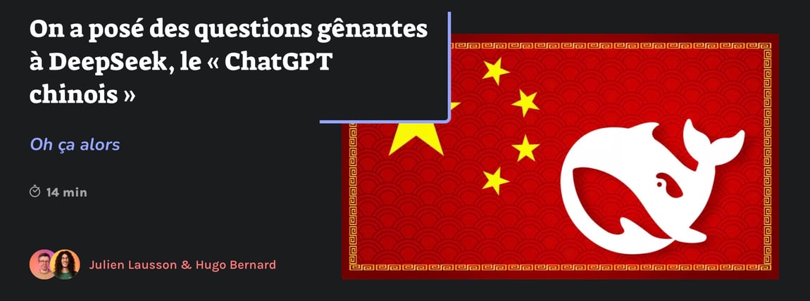 Sur un mode plus critique, Julien Lausson et Hugo Bernard de Numerama (dans un article du 24 Janvier) ont pour leur part, relevé qu’un internaute s’étonnait sur un forum de la réponse de Deepseek à une question posée sur Tien an Men. Alors les deux journalistes sont allés poser les mêmes questions (qui fâchent) à Deep-Seek et à Chat GPT 4o, sur Tien An men, les Ouïgours, le covid-19, le Tibet, Taiwan…