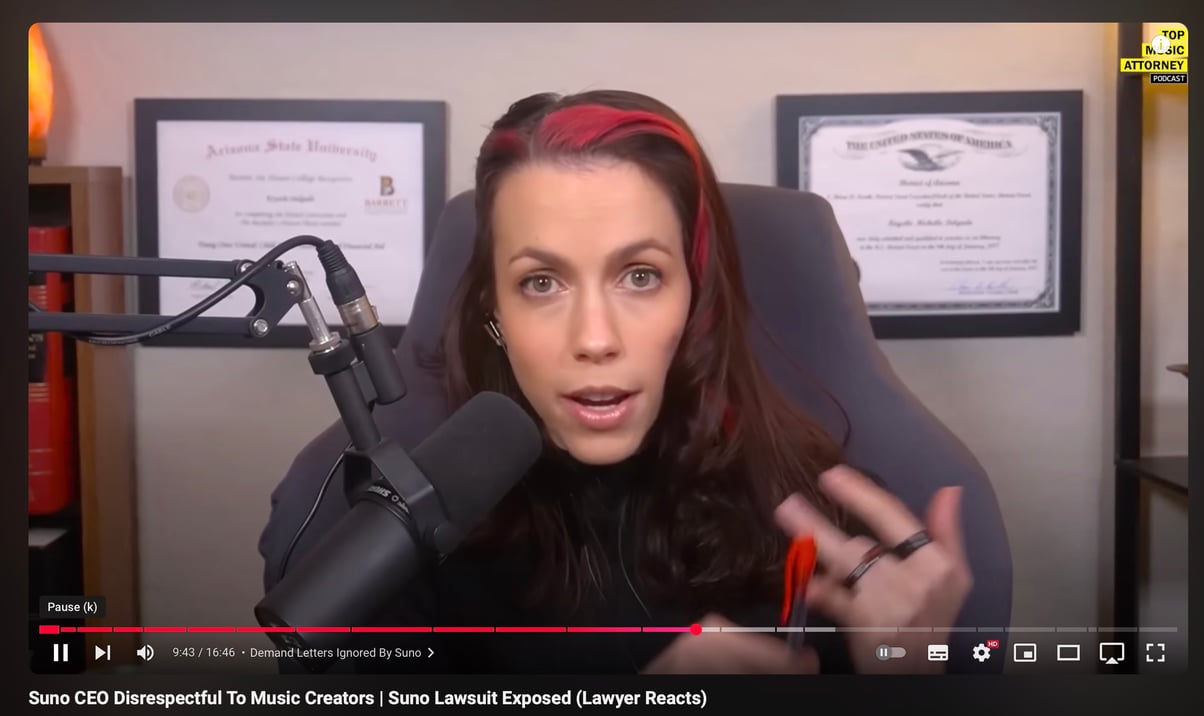 Les réponses n’ont pas manqué sur la toile comme par exemple celle de l’avocate spécialisée en droit de la musique, blogueuse et elle-même musicienne, Miss Krystle (de la chaîne YouTube Top music attorney), qui pointe les contradictions, contre-vérités et points litigieux du discours de Suno, évacuant systématiquement les ayant-droits.