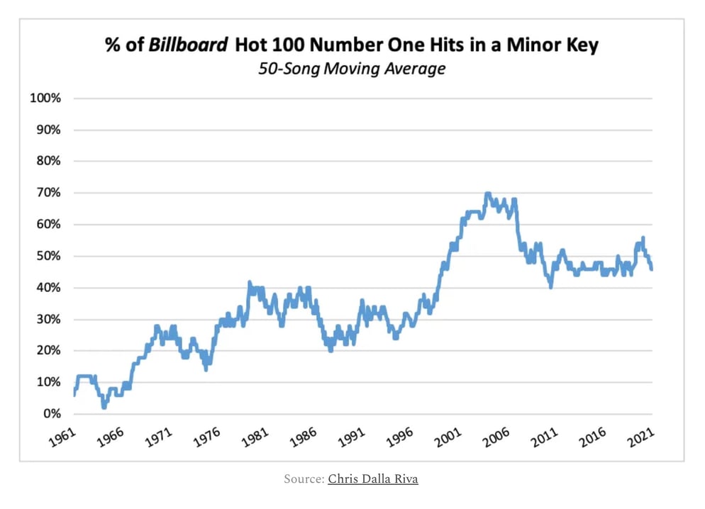 Autre indicateur, la prédominance des accords mineurs. Dans les années soixante, 90% des chansons étaient sur un mode majeur. Moins de 50% aujourd’hui selon une étude du data analyst Chris Dalla Riva, spécialisé dans la musique.