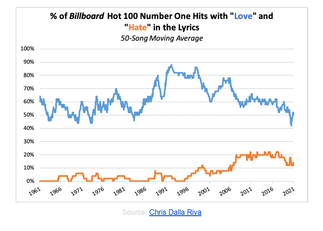 Haine, un mot qui, toujours selon le data analyst Chris Dalla Riva, observant le Top 50 américain 2021, apparait vingt fois plus que dans les années 60.